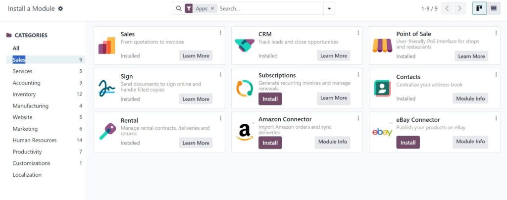 مجموعة شاملة: مع أودو، تحصل الشركات على مجموعة واسعة من التطبيقات التي تغطي مجالات أساسية مثل إدارة علاقات العملاء (CRM)، إدارة المخزون، المحاسبة، الموارد البشرية، إدارة المشاريع، التجارة الإلكترونية، والمزيد، وكلها مدمجة بسلاسة في منصة واحدة.